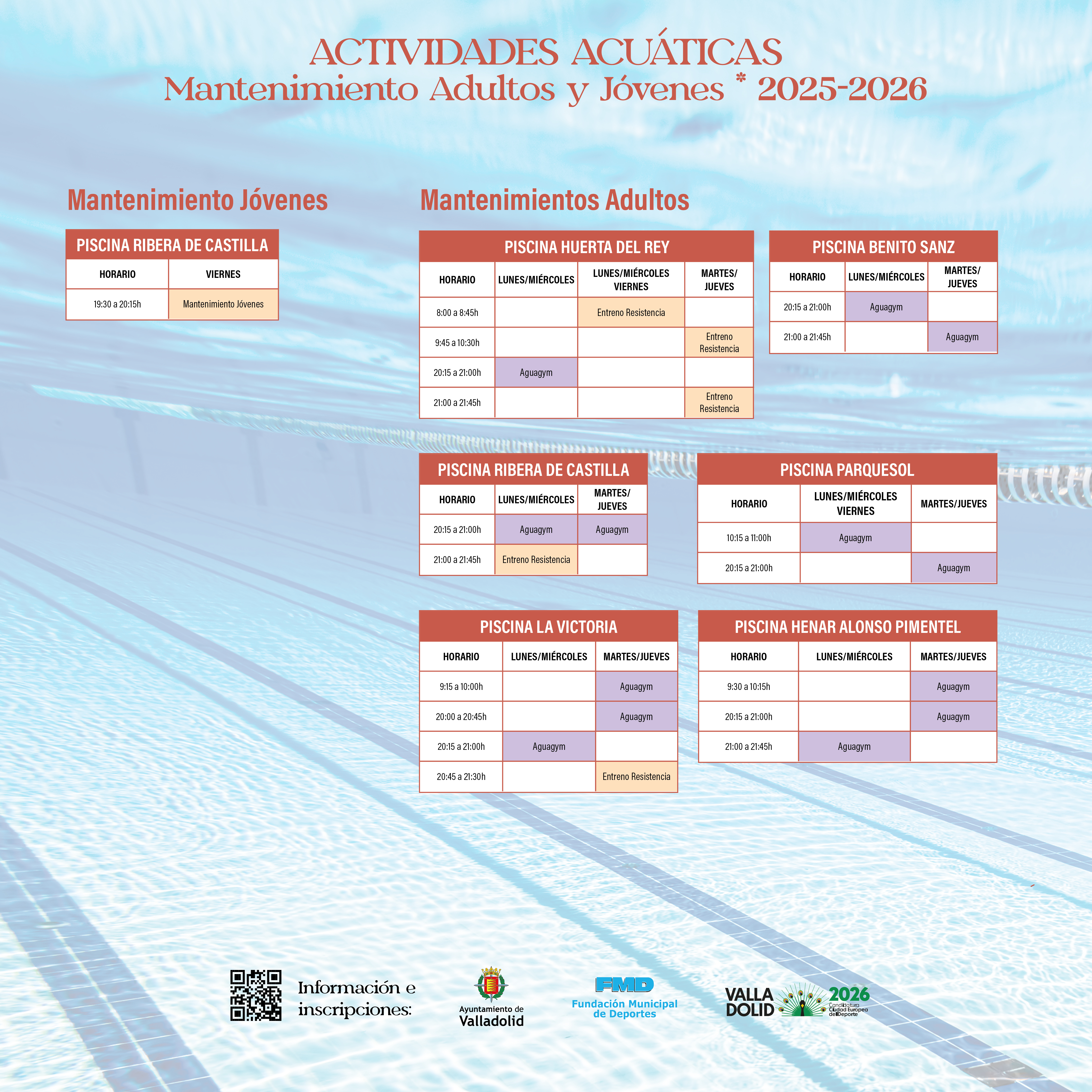 En el caso de nuevas inscripciones, pueden orientarse con la información de las diferentes modalidades y niveles que aparece al inicio de esta página, o bien contactar con la Unidad de Actividades Acuáticas en el teléfono 983 426 313 o en el correo electrónico: acuaticasfmd@ava .es.