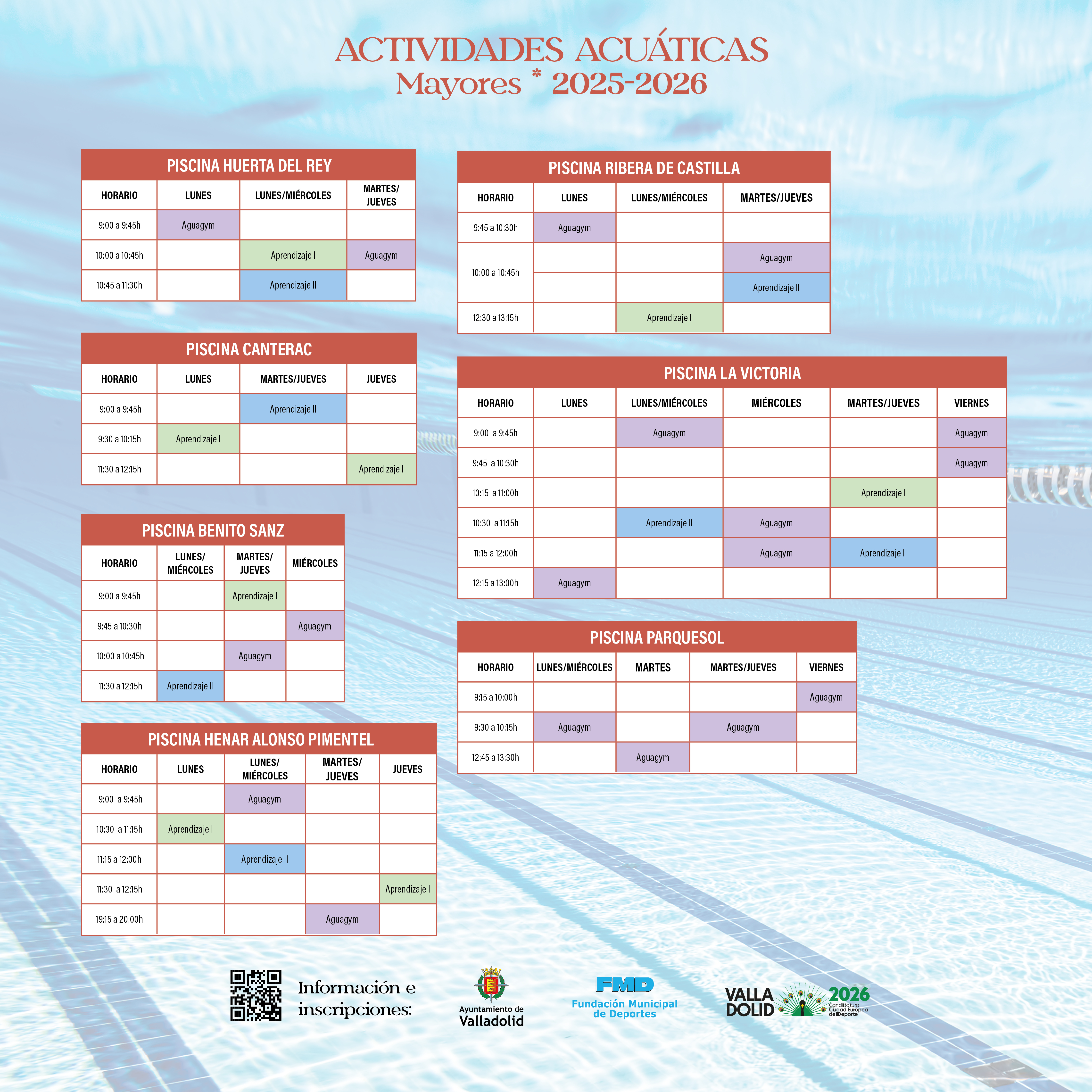 En el caso de nuevas inscripciones, pueden orientarse con la información de las diferentes modalidades y niveles que aparece al inicio de esta página, o bien contactar con la Unidad de Actividades Acuáticas en el teléfono 983 426 313 o en el correo electrónico: acuaticasfmd@ava.es.
